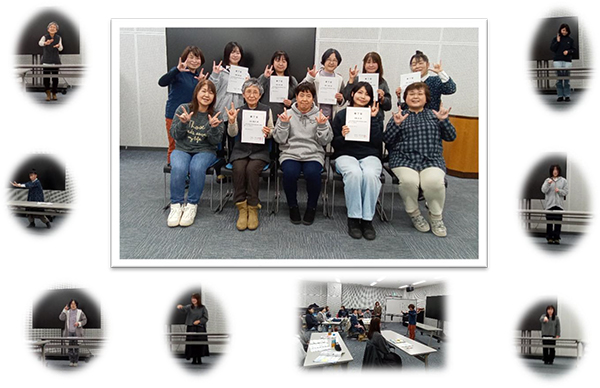 最後の実習「スピーチ会」では、自己紹介、家族、好きな食べ物や好きなことなどを手話で発表し、生き生きとした表情でこれまでの努力と練習の成果を披露しました。受講の感想では「長いようで短い期間だった、新しい世界を知った」「ろうあ者の方と冗談を飛ばす関係や、お酒を酌み交わしたい」とあり、皆さんの姿から、聴覚障がい者の福祉の向上のために活躍される未来を感じました。