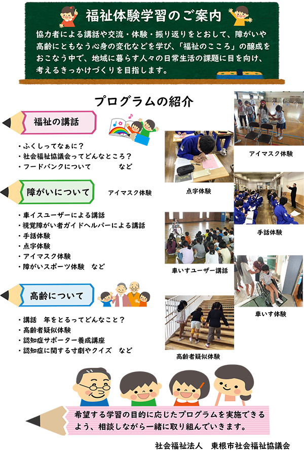 福祉教育推進事業(福祉教育推進校の指定)や小中学校、高校などの総合学習の支援を行うとともに、講話や体験を通して福祉について考える授業のお手伝いをしています。