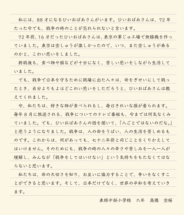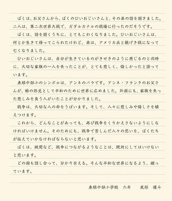 献花に続き、市内小学生を代表して東根中部小学校6年生の尾形優斗君と高橋空桜さんが平和の作文を朗読し、曽祖父母の“戦争でとても辛い経験をした話”や“命の尊さについて”など、心に響くメッセージに参列者一同、平和への誓いを新たにしました。
