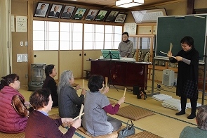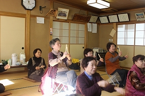 1月16日、神町下区「陽だまりサロン」にて冨樫さち子先生、吉田京子先生より「歌って、笑って楽しい時間」と題して、音楽をとおしての活動を行いました。ヤクルトの容器で作ったシェーカーやスティックを使ったり、懐かしい歌を歌うなど、参加者のみなさんは、若い頃にもどったように笑い活き活きしていました!! みなさんの歌声はすばらしく、まるで下区合唱団!!