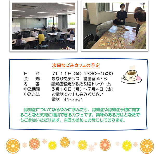 令和7年6月13日( 金)、まなびあテラスにてなごみカフェを開催しました。今回は、「脱水と熱中症予防」のミニ講話のあとに「認知症啓発かるた」で交流しました。始めて参加いただいた方もおりましたが、かるたでの交流をきっかけにカフェタイムでは日頃の介護のお話などをしながらゆったりと過ごしていただきました。
