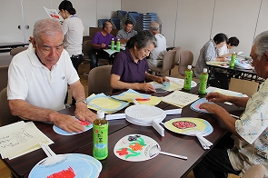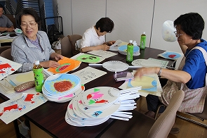 市内の保育所と児童センターの4,5歳児からスイカやひまわりなど夏らしい絵を描いていただき、もう片面には、社協の事務局長が書いた「ここちよい涼しさで笑顔いっぱい」などのメッセージを添え、7月28日に、ボランティアグループ快生からご協力いただき、うちわ360枚を作成しました。