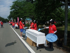 6月5日(日)、「第15回果樹王国ひがしね さくらんぼマラソン大会」が開催されました。12,000人を超える選手が参加し、社会福祉協議会職員5名も、自衛隊広報センター前で、給水班として選手の皆さんに給水のお手伝いをしました。選手の皆さんからは、「ありがとう」「生き返った!!」と喜んでいただきました。