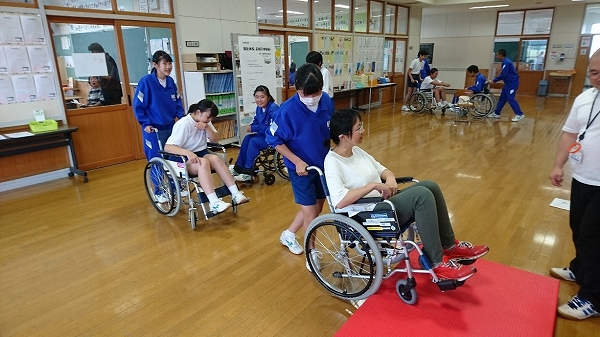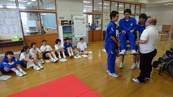 車椅子生活をしている吉田さんと荒井さんから、車椅子生活のお話しを伺いました。お二人の話から、身体の不自由な人の苦労を感じるとともに、自分たちで何ができるかを学ぶことができたそうです。