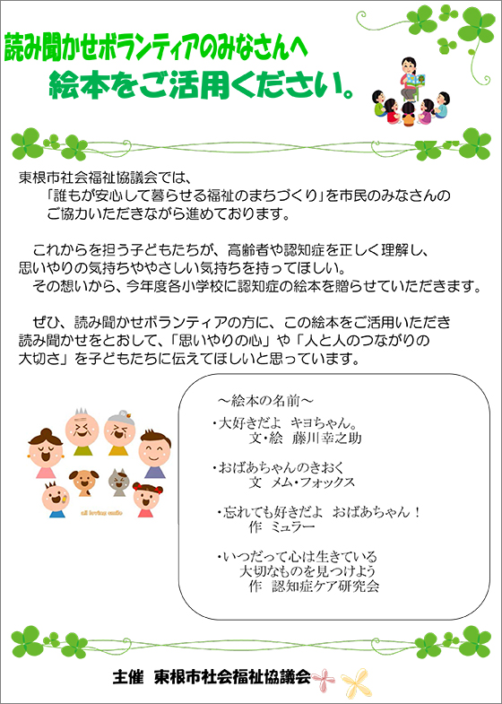 ぜひ、読み聞かせボランティアの方にこの絵本をご活用いただき、読み聞かせをとおして、「思いやりの心」や「人と人のつながりの大切さ」を子どもたちに伝えていただき、これからを担う子どもたちに、高齢者や認知症を正しく理解し、人を思いやるやさしい気持ちを持ってほしいと思います。