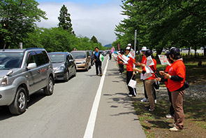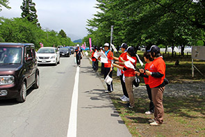 6月8日(日)、「第13回果樹王国ひがしね さくらんぼマラソン大会」が開催されました。当日は、12,000人を超える参加者を迎え、社会福祉協議会職員5名も、自衛隊広報センター前で、給水班として選手の皆さんに給水のボランティアをしました。選手の皆さんからは、「ありがとう」「生き返った!!」と喜んでいただきました。
