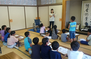 7月25日(月) 東郷公民館で開催中の「東郷おさるさん公民館」におじゃましました。「東郷おさるさん公民館」は、東郷地区の小学生の子どもたちが、長期休み期間中に地域の方に協力を得て、絵画教室や英語、パン作り、車椅子操作体験…など、宿題や勉強の他に本格的な講座をひらき、学び合いふれあい過ごす、素敵な地域の居場所です。