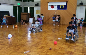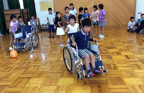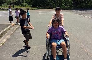この日は、車椅子操作体験をおこないました。車椅子の操作方法を学んだあと、どのような方が車椅子を必要としているのか、車椅子を操作する際に地域内で不便なところや工夫されているところはどこにあるのか等、参加した子ども達からは積極的な意見が飛び交いました。その後は、実際に車椅子を操作して、スロープや段差、屋外の危険な箇所などを確認しました。