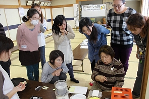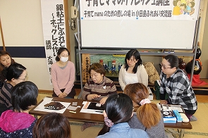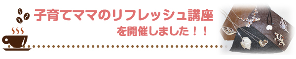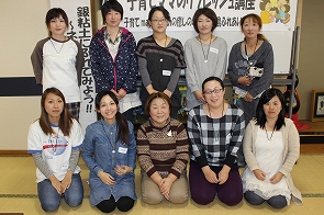 2回目になる今回は、子どもさんをファミリーサポートによる託児に預けて、「銀粘土にふれてみよう!」~ネックレス作り~と題してインストラクターの大滝則子氏と一緒に世界に一つのオリジナルネックレスを作りました。みなさん、とても素敵な作品ができあがり、さっそくネックレスをつけてみんなで写真を撮りました。また、お茶会を行いわきあいあいと交流を図りました。
