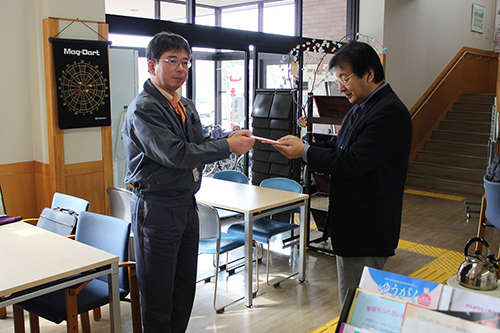 当日は、職員を代表して総務部総務グループ グループリーダーの村形隆義氏がふれあいセンターを訪れ、常務理事兼事務局長に手渡しました。ありがとうございました。 今年度、職員のみなさん全員でアルミ缶回収に取り組み、その売上金を地域福祉活動に使って下さいと温かい気持ちをいただきました。