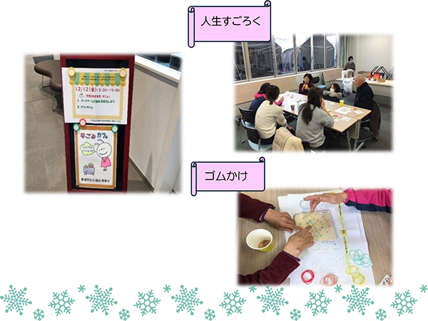 令和7年12月12日(金)、 まなびあテラスにて、なごみカフェを開催しました。今回は、「カードゲームで脳の活性化」をテーマにカードゲームや人生すごろく、ゴムかけなどを行いました。