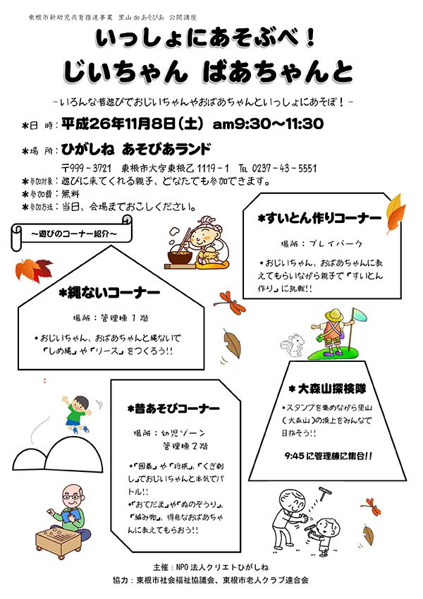 11月8日(土)、あそびあランドにて NPO法人クリエイトひがしね主催で「いっしょにあそぶべ!じいちゃん ばあちゃんと」を開催します。東根市社会福祉協議会も協力しています。当日は、東根市老人クラブ連合会と神町中学1年生もボランティアで参加します。たくさんのみなさんの参加をお待ちしてます。