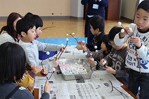 1月23日(木)、高崎小学校の1,2年生が老人クラブ会員と一緒に「だんごさし」を体験しました。伝統行事を子どもたちに知ってもらい、世代間の交流の場として高崎小学校と高崎公民館が一緒に毎年開催しています。