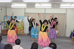 すみれ会の方々は、地元の「なるせコーラス愛好会」とコラボレーションし、小野地区の方々に、童謡を唄ったり、合唱を行ったりしていただいたのち、東根市のリンゴやラフランス、ぶどうなどを食べながら交流を図りました。NPO法人大けやきフォーラムの方々は、太極柔力球の演技やフラダンスのご披露いただき、さらに参加者の方々と一緒にストレッチ体操を行いました。