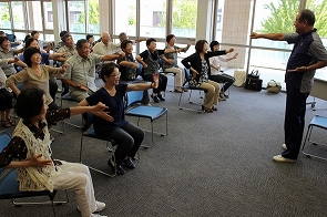 「サロンってなあに」と題して山形県社会福祉協議会地域福祉部地域支援係係長の横尾晃氏が講話を行い、その後、山形県レクレエーション協会 副理事長 鈴木藤弥氏から「サロンで役立つレクレエーション」ということで、楽しい手遊びや身体を使ったレクリエーションなどを教わりました。