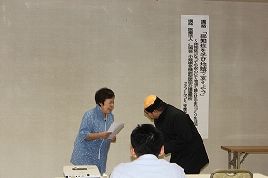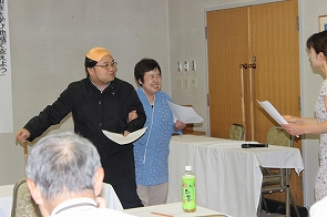 また、女将や従業員の方からご協力をいただき、「あれ、なにか悪いこと言った?~出迎えの場面~」「お部屋はこちらです」等、軽い認知症状が出てきた方への旅館でのやりとりの寸劇を行いました。旅館でも実際にある事例の寸劇だったので、とてもわかりやすかったようで、大変好評でした。