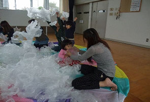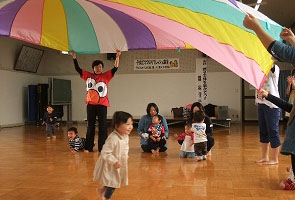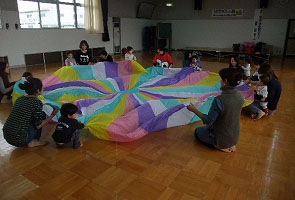 ・体操では、七色の布を使った遊びが楽しかった。息子も楽しそうで、良い汗をかけました。