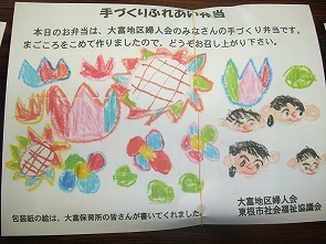 「大富地区婦人会のみなさん、手作り弁当ありがとうございました!!」「大富保育所のみなさん、かわいい絵を描いて下さりありがとうございました!!」