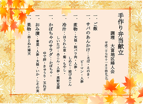 11月14日(土)大富地区の婦人会のみなさんより、ふれあい弁当を手作りして頂きました。