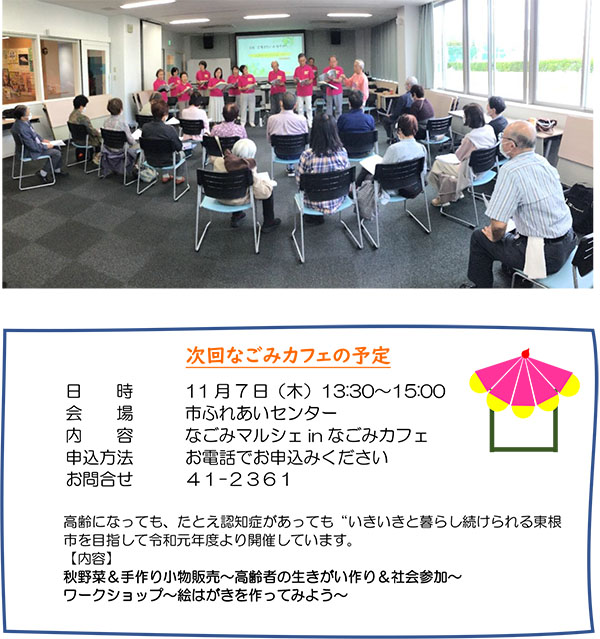 令和6年10月11日(金)、まなびあテラスにてなごみカフェを開催しました。今回は、東根混声合唱団のみなさんをお迎えし、「合唱のハーモニーで癒しの時間を過ごそう」をテーマにおこないました。