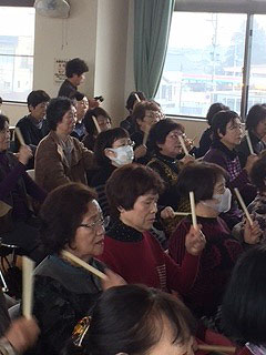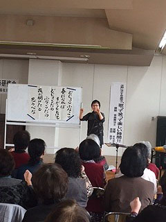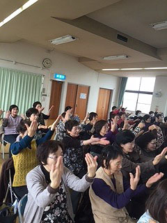 今回は、音楽療法士の冨樫さち子さんと吉田京子さんより「歌って笑って楽しい時間」と題して音楽をとおしての活動を行いました。冨樫先生には7年間毎年ご協力いただき、先生との活動を楽しみにしているファンの方もたくさんいらっしゃいます。神町公民館は春から新しい場所に移転するので、今の公民館での最後の活動になりました。春の曲、別れ、旅たちの曲としてみんなで「仰げば尊し」「蛍の光」を歌いました。
