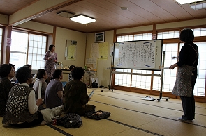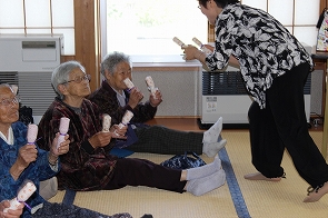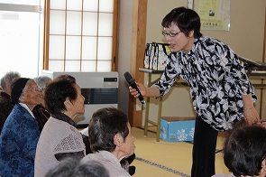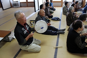 9月30日(水)、大富地区羽入「つつみばたサロン」にて冨樫さち子先生、柴田みゆき先生より「歌って、笑って楽しい時間」と題して、音楽をとおしての活動を行いました。つつみばたサロンでは、毎回サロンのはじめに、つつみばたサロンの歌を必ず歌うそうです。なので、みんなの声が出てすばらしかったです。