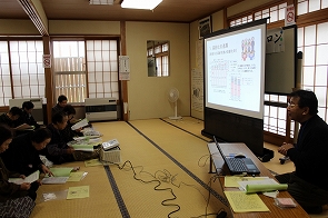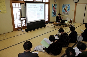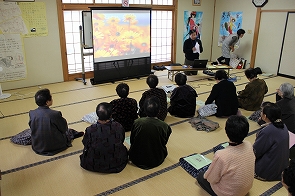 11月28日(金)、大富地区羽入「つつみばたサロン」がありました。東根市社会福祉協議会 常務理事兼事務局長 佐藤信行が「長寿社会と高齢者の生きがい」と題して、東根市の高齢化の状況や生きがいづくりの必要性や社会福祉協議会の高齢者支援策について話しました。その後、事務局長の得意な電子シアターによる民話の語りを行いました。