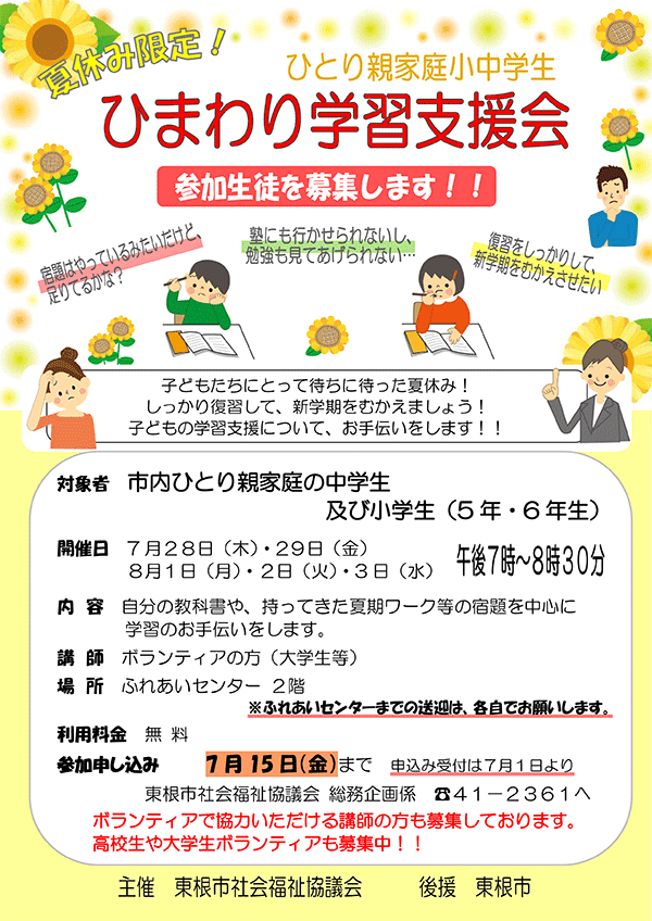 夏休み限定 ひまわり学習支援会 生徒・ボランティア募集!!