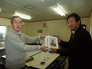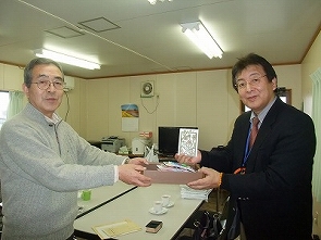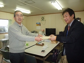 3月13日(木)、東松島市社会福祉協議会 阿部常務理事に、みなさんのあたたかい気持ちを代表して、東根市社会福祉協議会 佐藤事務局長がお届けしました。