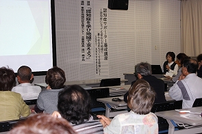 9月30日(火)、公明党東根支部会の9月定例会にて、認知症について学習したいと要望があり今回の開催になりました。党員以外にも知り合い等にちらしを配ったり声かけしていただき50名の方から参加いただきました。また、今回は、参加者の方に聴覚障がい者の方がおり、手話通訳者の方に手話通訳していただきました。東根市地域包括支援センターの主査兼係長滝口典子が「認知症を学び地域で支えよう」 ~いつまでも住み慣れた地域で過ごすために~と題して、認知症の症状や接し方等、見守り声かけ、地域で支えるにはどうしたらいいか、具体的なお話をしました。後半は、常務理事兼事務局長佐藤信行が「大好きだよ キヨちゃん。」の絵本の読み聞かせをしました。
