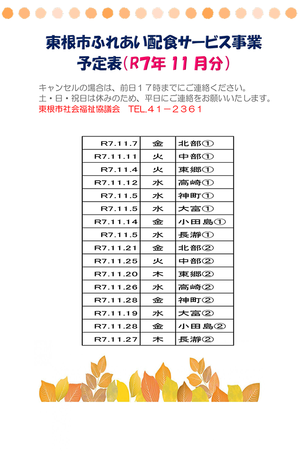 東根市ふれあい配食サービス事業予定表(R7年11月分)
