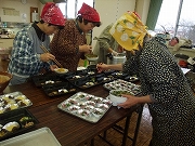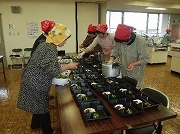 さんまの煮付・芋煮・五色人参の胡麻和え・菊とほうれん草のおひたし・おみ漬・ラフランスなど…旬の色とりどりの材料で、和気あいあいと手際良く料理が作られ、栄養満点の美味しそうな弁当が出来上がりました。