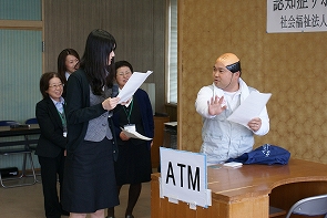 また、職員の方からご協力をいただき、「ATMの操作に困った事例」や「印鑑通帳がない」等、軽い認知症状が出てきた方への窓口でのやりとりの寸劇を行いました。窓口でも実際にある事例の寸劇だったので、とてもわかりやすかったようで、大変好評でした。