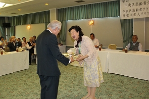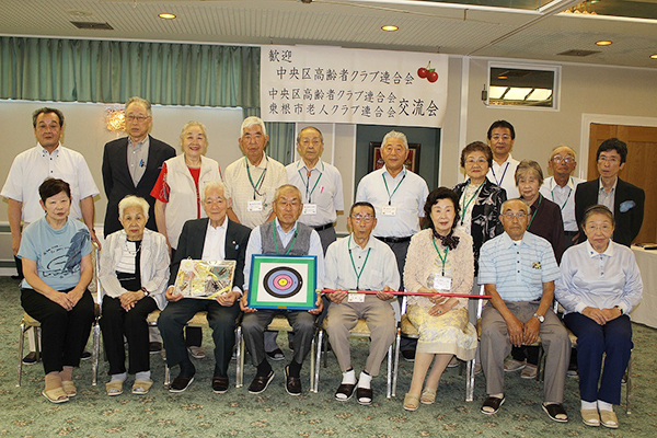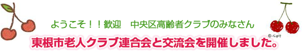 記念品交換では、東根市老人クラブ連合会からは、さくらんぼと地酒、女性部の手作りの爪楊枝とエチケット袋入れが贈られ、中央区高齢者クラブからは、健康吹き矢の用具一式をいただきました。