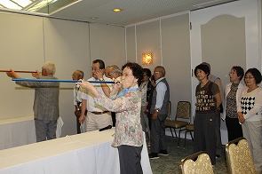 交流会では、「健康吹き矢」を中央区の方から教わり、試合形式で一緒に和気あいあいと楽しみました。