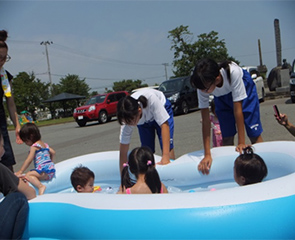 サロンで使うビニールプールの準備・片づけ、来館幼児へのお名前シール付けやバックミュージック用CDの入れ替え等、サロン参加者との交流を時間まで体験してもらいました。