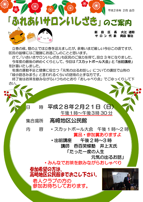 2月21日(日)、啓翁桜の里、高崎地区ふれあいいきいきサロン「ふれあいサロンいしざき」にて、今年度の最後の締めくくりとして