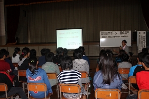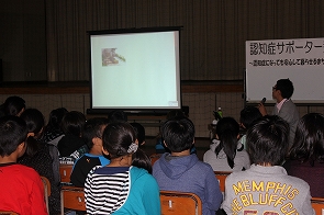 講師は、地元の大富地区の介護施設 居宅介護支援事業所 まごころの管理者 藤田賢悟先生から「認知症ってなあに?~高齢者や認知症を知ろう 私たちにできること~」と題して、認知症の症状や接し方等、見守り声かけ、地域で支えるにはどうしたらいいか、具体的なお話を伺いました。また、藤田先生の勤務する施設に、子どもたちが交流に来た様子を写真でみせていただきました。
