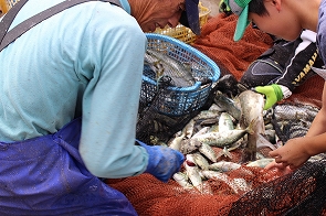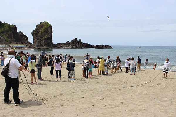 地引網体験では、皆で力を合わせて網をひき、砂浜に網が近づくと、大漁の魚に子どもたちは歓声を上げて喜んでいました。