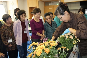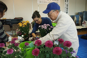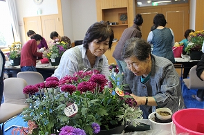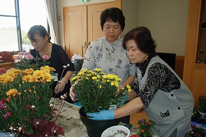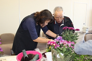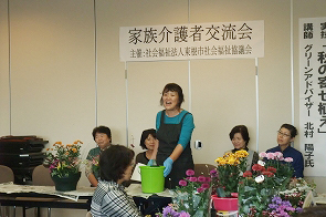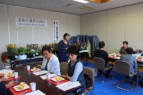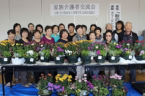 日頃、介護されている方がリフレッシュし、他の介護者の方との交流を目的に市から委託を受けて年に3回社協で開催しています。今回は、2日間で34名が参加し、前半はふれあいセンターでグリーンアドバイザーの北村陽子氏を講師に秋の寄せ植え講座を開催しました。その後、おによめ.comによるおいしいドルチェでお茶会、さらに、会場を市内の心月に移動して昼食交流会を行いました。