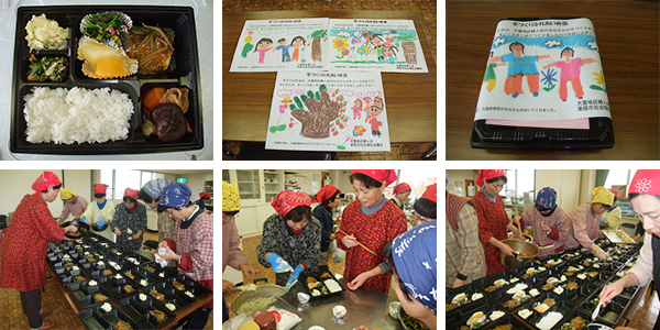 今回の弁当の包装紙は、大富保育所の園児のみなさんが一枚一枚ていねいに書いて下さいました。