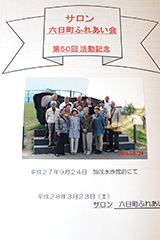 六日町ふれあい会は、平成22年9月から、結城民生委員児童委員を中心に福祉推進員や地区のボランティアなどが協力して活動を続け、今回で50回目のサロンでした。今回は、50回を記念して今までの活動をまとめた冊子を制作して参加者のみなさんに配布しました。また、サロンのおしらせのちらしは、前回のサロンの楽しい写真を掲載するなど民生委員さんが作成しています。また、食生活改善推進員の福祉推進員を中心に味噌汁の塩分測定などいろいろな楽しい内容で継続しています。ぜひ、100回目めざしてがんばってください!!