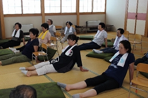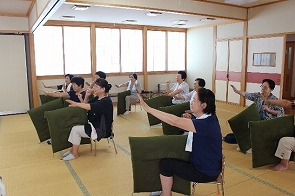 今回は、介護予防の軽体操を教えて下さる小野淳子さんを講師にお呼びしました。今回のサロンは、さくらんぼ作業の疲れを癒すための全身の体操、がテーマ。笑い声を響かせながらの体操で、心身共にリフレッシュできたと思います。以前もサロンに来て下さった講師ということもあり、体操後も、みんなで先生を囲んでのお茶飲み会でいろんな話題で盛り上がりました。