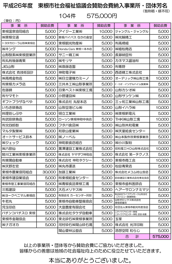 26年度もたくさんの企業・団体より、東根市社会福祉協議会賛助会費にご協力いただき、誠にありがとうございました。