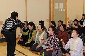 各自、ビーンズバックを上に投げてキャッチします。二人で投げ合っても楽しいです。 ビーンズバックは、簡単に作れますので、 ぜひ、つくってみて下さい。 | | ハンドベルで「ふるさと」の演奏みなさん「御詠歌」で慣れているためか、ばっちり息が合います。 |