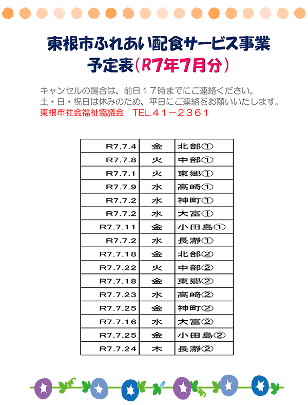 東根市ふれあい配食サービス事業予定表(R7年7月分)