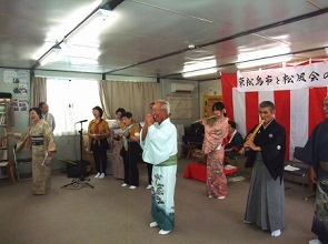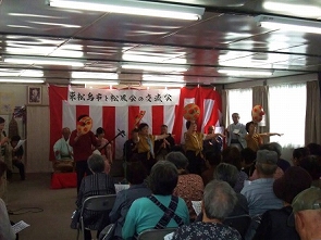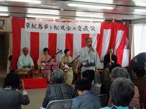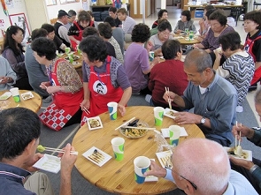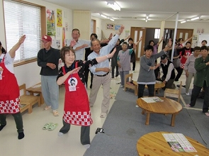 JAたんぽぽでは、花笠音頭に合わせた介護予防体操をみんなで行い、その後、モチを振る舞い、交流会を行いました。松風会の方々からは、民謡や踊りを披露していただき、その後、リンゴやラ・フランスを振る舞い、みんなで交流会を行いました。