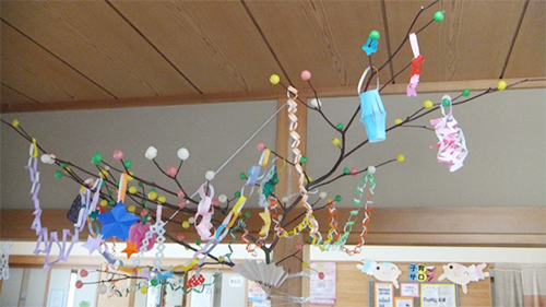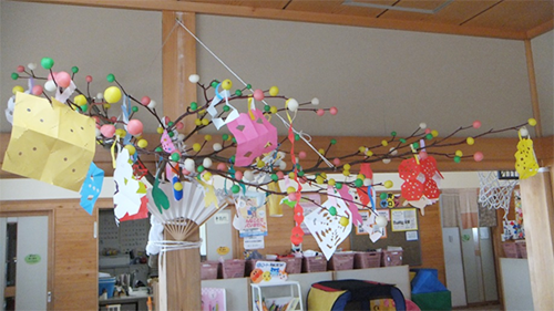 小田島学童クラブの子ども達にだんごさし・飾り付けをしてもらい、だんごの木が2本完成しました。