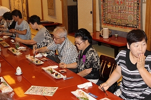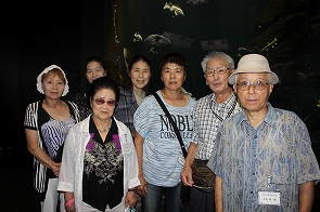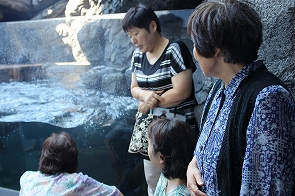 鼠ヶ関鮮魚センターにて、イカの一夜干し体験、その後、昼食交流会では、おいしいおすしを食べ、今年リニューアルした加茂水族館を見学し、日頃の介護の疲れを忘れて、楽しい時間を過ごしました。バスの中でもみなさんが同じ悩みを持っていることもあり、話もはずみ、楽しく過ごされていました。