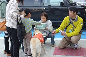 4月12日(日)、ヤマザワ神町店、店頭入口にてボランティアグループ「快生」のみなさんの協力を得て、盲導犬ふれあい募金活動を行いました。
